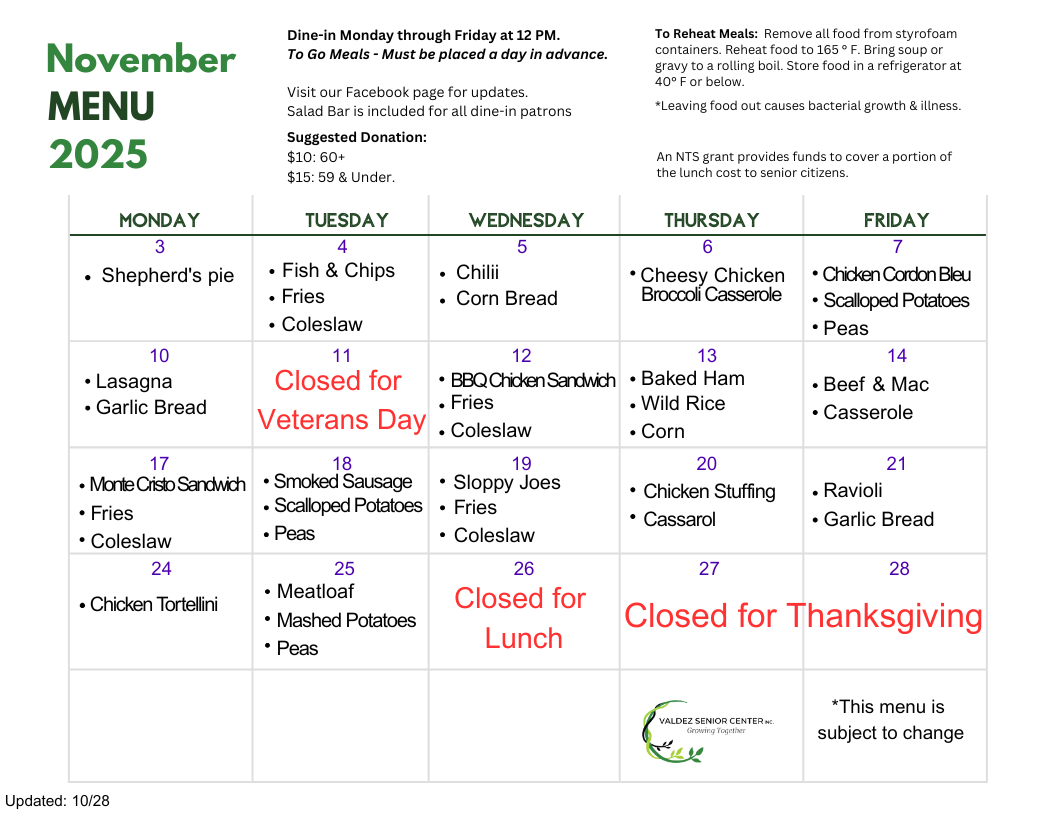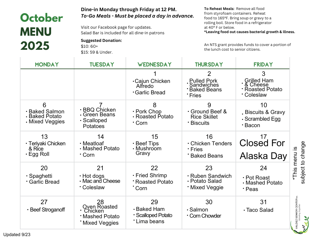 The Valdez Senior Center, Inc. is happy to be a part of the Meals-On-Wheels Program. To be able to provide this service to persons 60 years or older who are unable to attend congregate meals for a number of reasons.